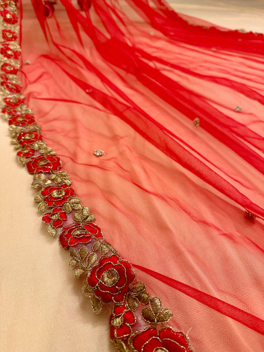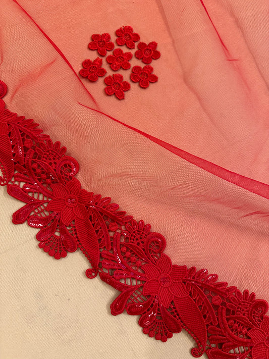 Flora : Red Tulle Veil with floral border and Logo personalised