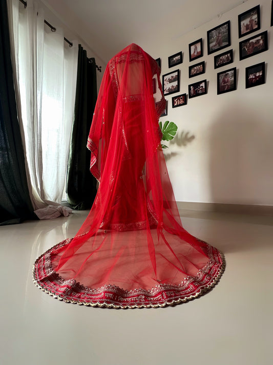 Mirrored Majesty – Regal Red Bridal Veil with Scalloped Mirror Border & Stone-Embellished Logo