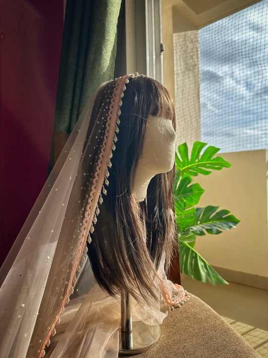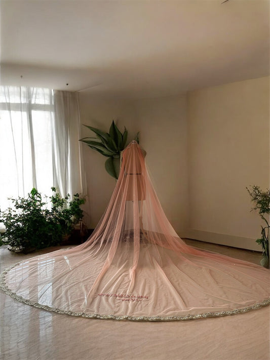 Peach Ombre Pearl-Stone Bridal Veil | Cathedral Length with Pearl Drops