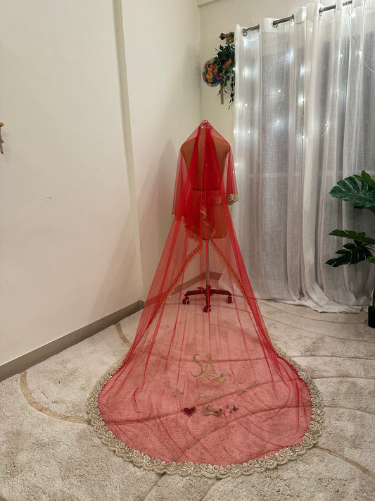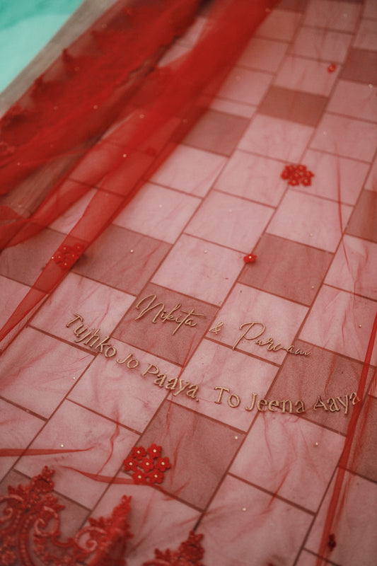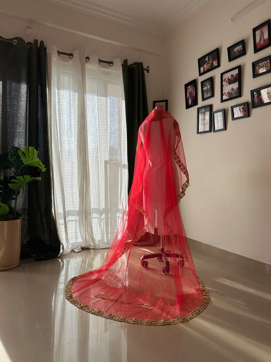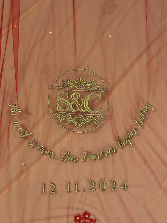 Royal Affair: Red Monochrome Bridal Veil with Gold Embroidered Wedding Logo
