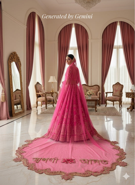 Padmavati: A Custom pink Bridal Veil with Embroidered Border & Lotus Personalisation