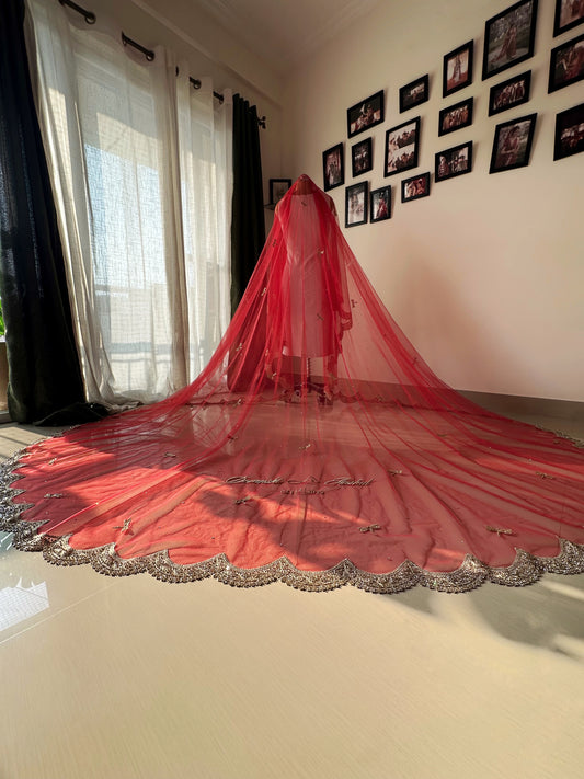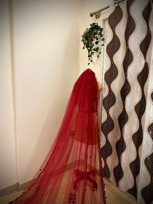 Ruby woo - A Red Chapel length Veil with Ombre stone embellishment.