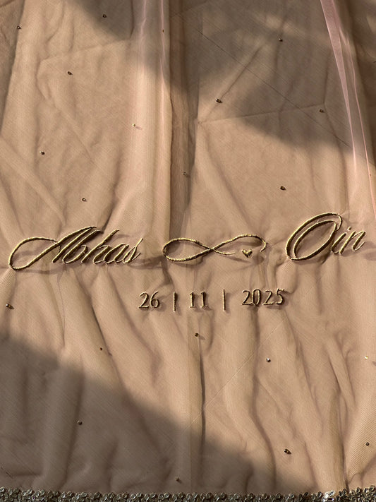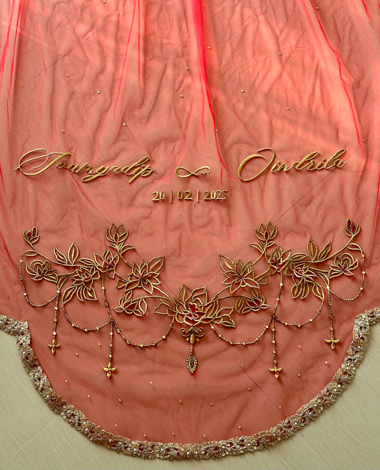 Sheesh Mahal : A Peachy-Pink mirrored Cathedral length Bridal Veil with embroidered personalisations