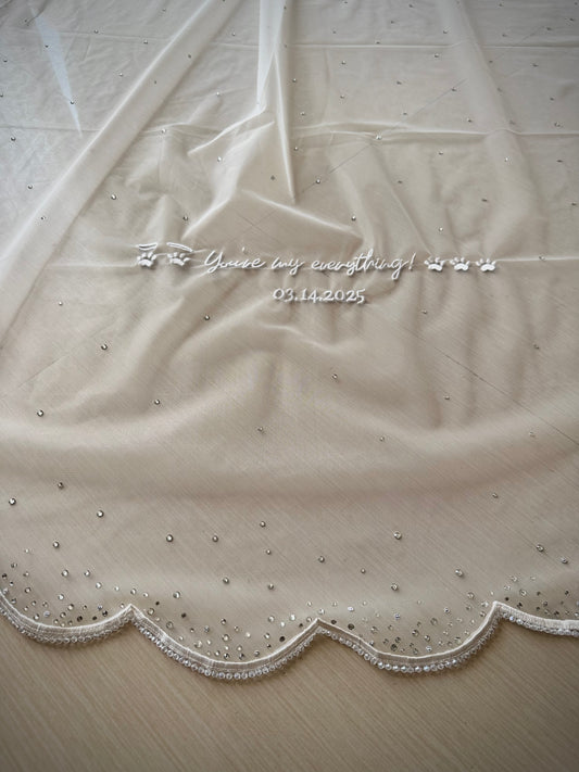 Whisper of Whiskers – Scalloped Cathedral White Veil with Ombré Stones & Custom Dog Detail