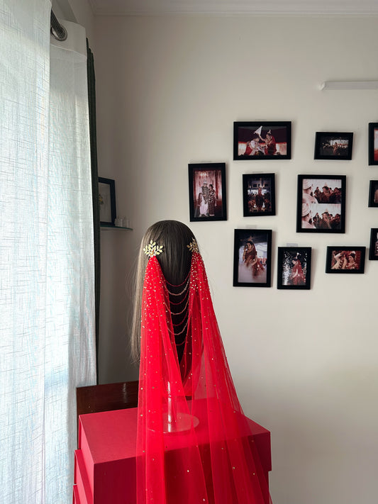 Arwyn : The jewelled Red Draped Veil with Greek-Floral hair accessories and Zircon Stone embellishment