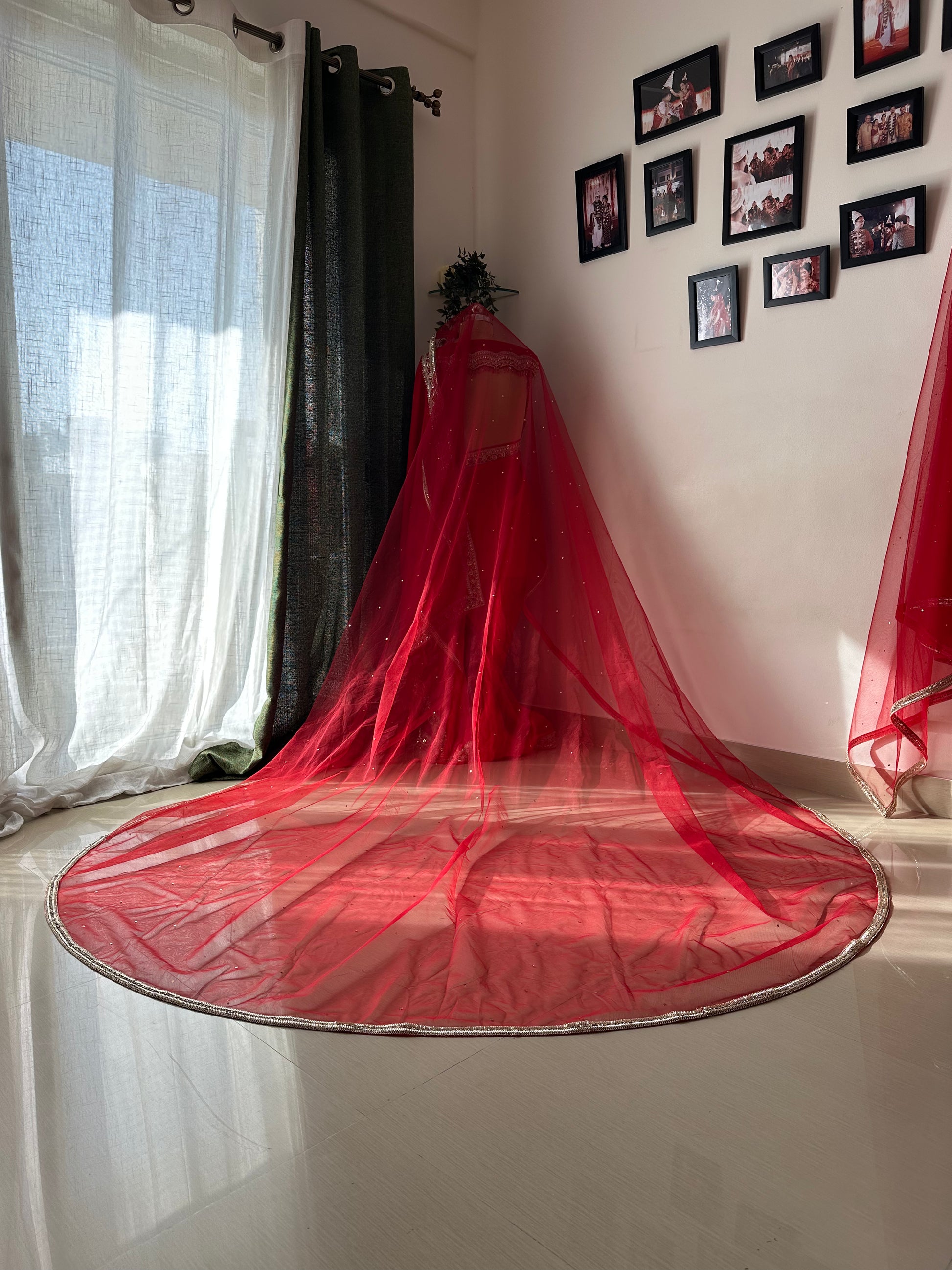 Placed at the crown, the veil sits gracefully, allowing the fabric to flow naturally and enhance the bridal ensemble. Finished in the exact colour matched to the approved sample, this piece is timeless, versatile, and perfect for brides who appreciate understated luxury.