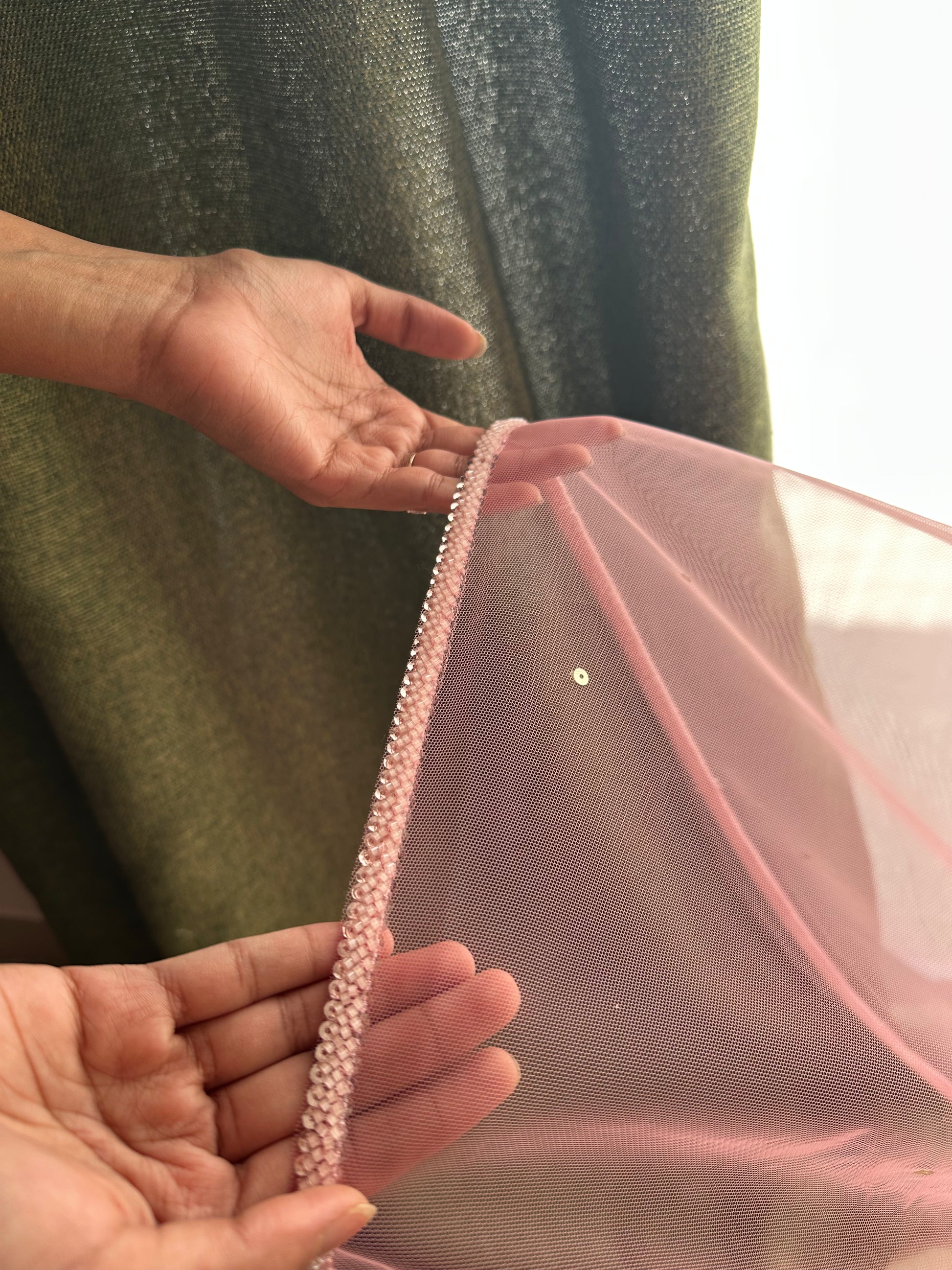 Our Pink Beaded Cathedral Length Veil is designed for brides who want to shine—literally and metaphorically. Crafted with finely placed sequins embellishments, this veil shimmers softly with every step, creating a luminous halo effect around the bride.