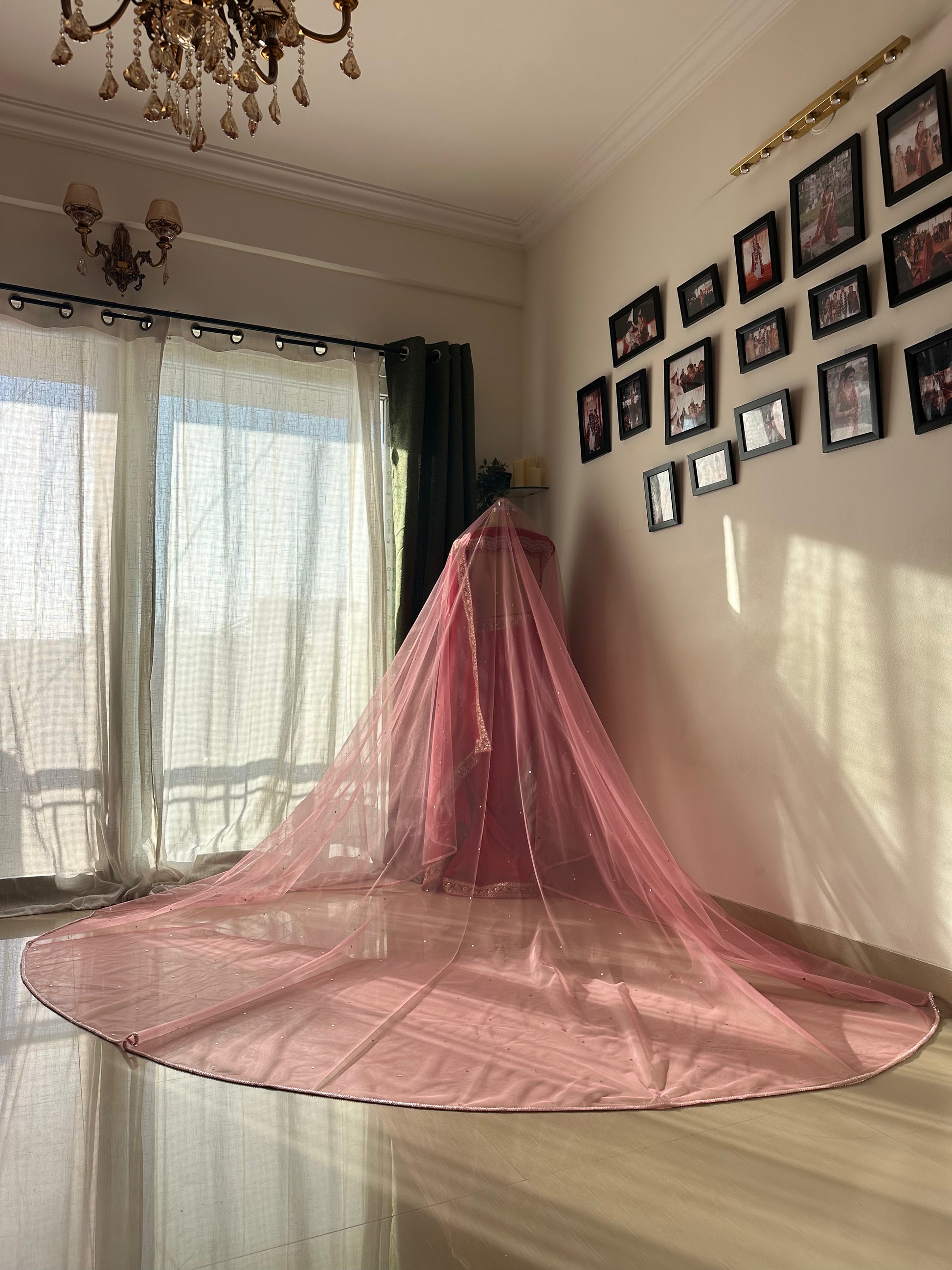 Whether you’re walking down the aisle or twirling on the dance floor, this veil ensures all eyes stay on you. The soft baby pink hue adds a romantic warmth, while the cathedral length brings in grandeur and drama—perfect for a statement bridal look that feels refined and elegant.
