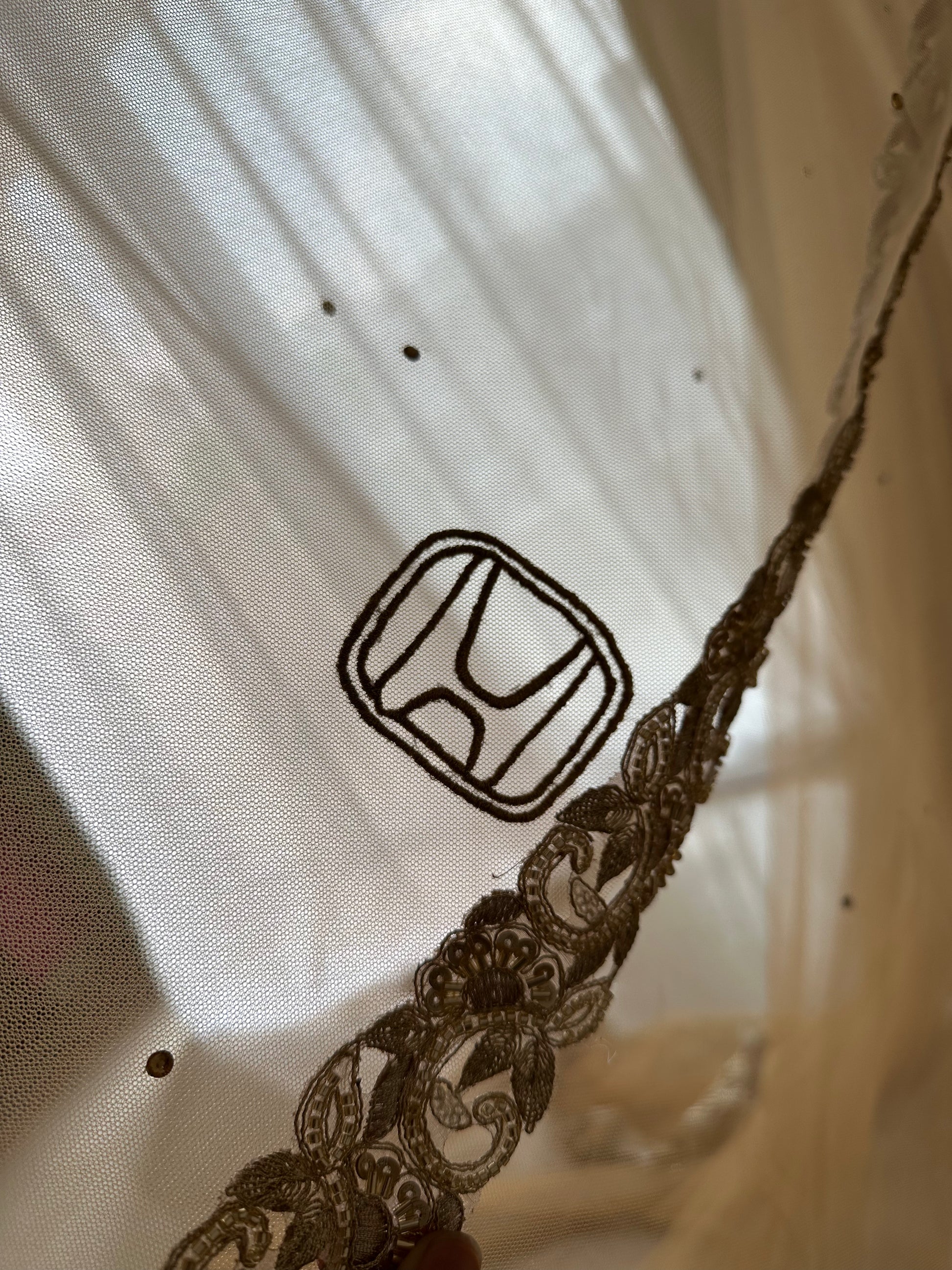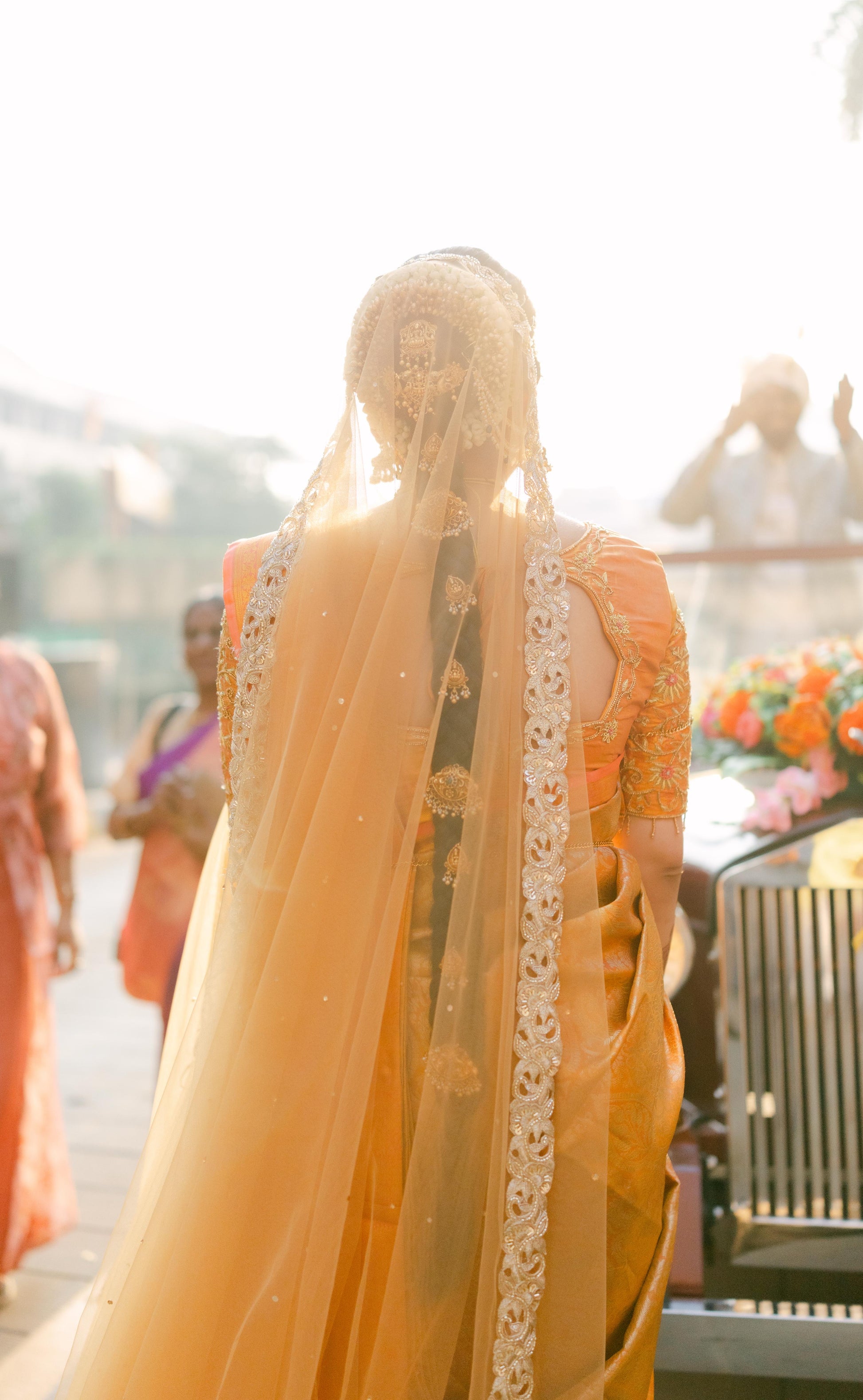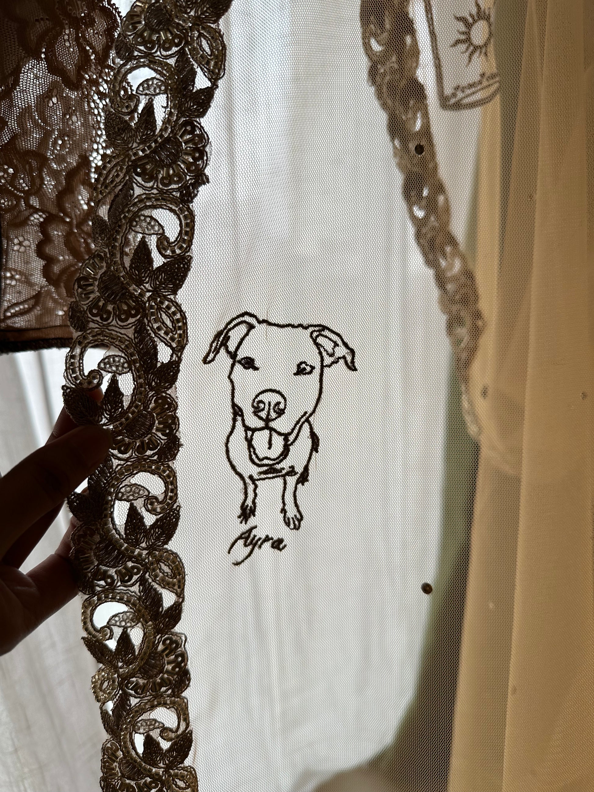 The floral golden handcrafted cutwork border is delicately adorned with multi-size gold zircon stones, creating a radiant shimmer with every movement. Personalised with the couple’s names, wedding date, and 10 gold metallic thread embroidered story-telling motifs, it celebrates your unique journey. A personal quote adds the final touch — making this veil not just an accessory, but a piece of art that tells your love story.