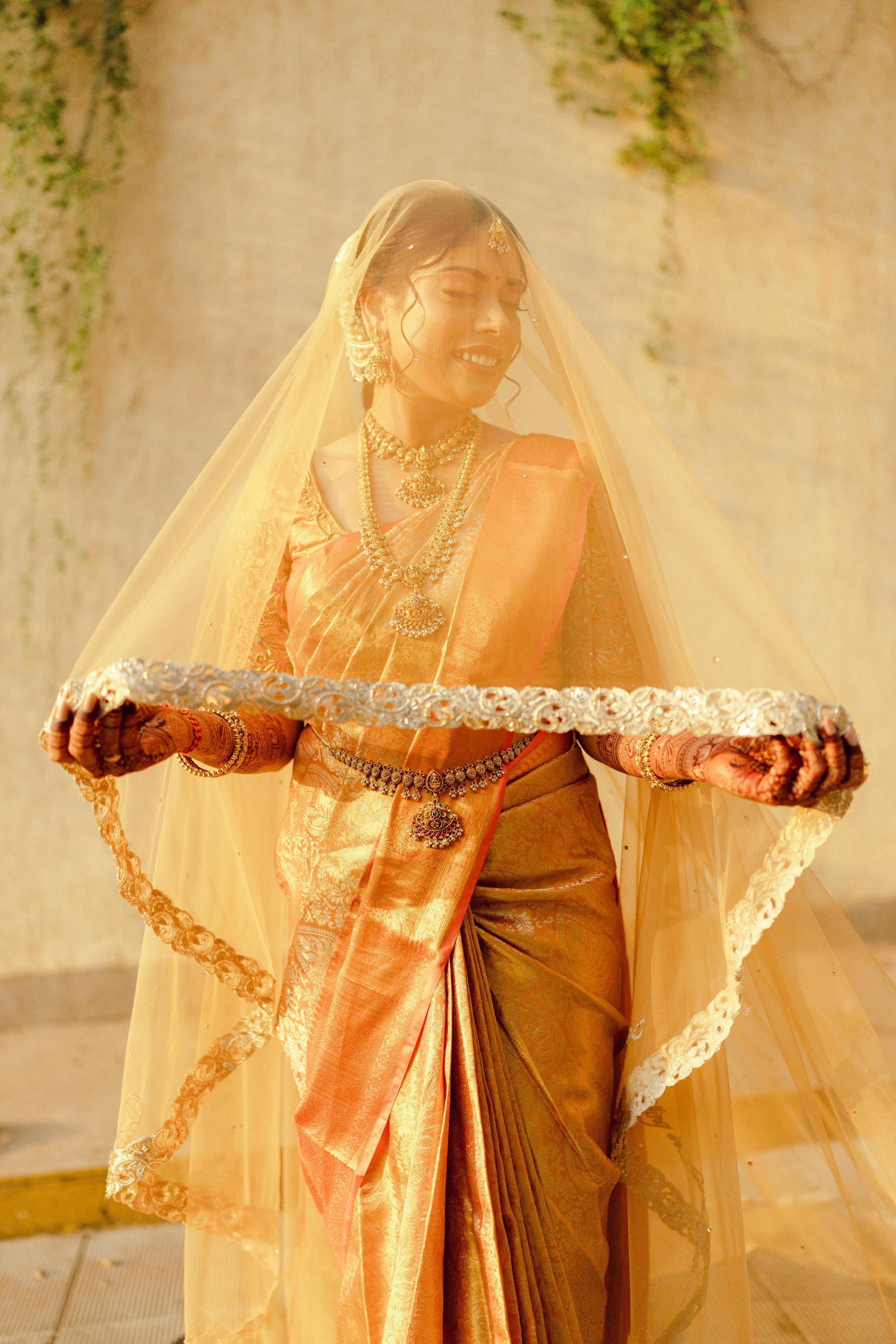 Step into timeless elegance with our Gold Full-Flared Illusion Tulle Veil, meticulously crafted from Italy-imported illusion tulle for a dreamy, ethereal drape. Measuring 3 meters in length with a stunning 120-inch flare, this no-joining veil flows flawlessly from crown to face-cover placement.