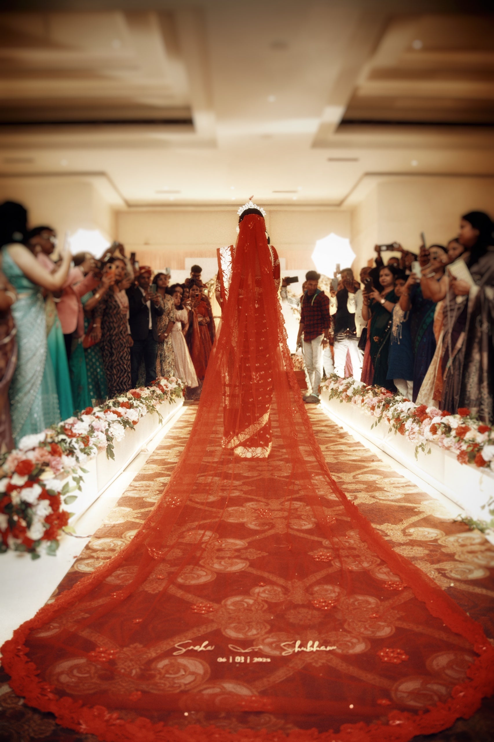 This timeless red-on-red creation is elevated with intricate gold zari embroidered names, framed by regal peacock motifs on either side—symbols of grace and beauty. Inspired by the bride's attire, the design perfectly balances rich red tones with the opulence of her gold jewelry. The scalloped red floral lace adds a classic touch, while the red 3D floral accents bring a modern, dimensional flair. A masterpiece that combines tradition, elegance, and personalised artistry.