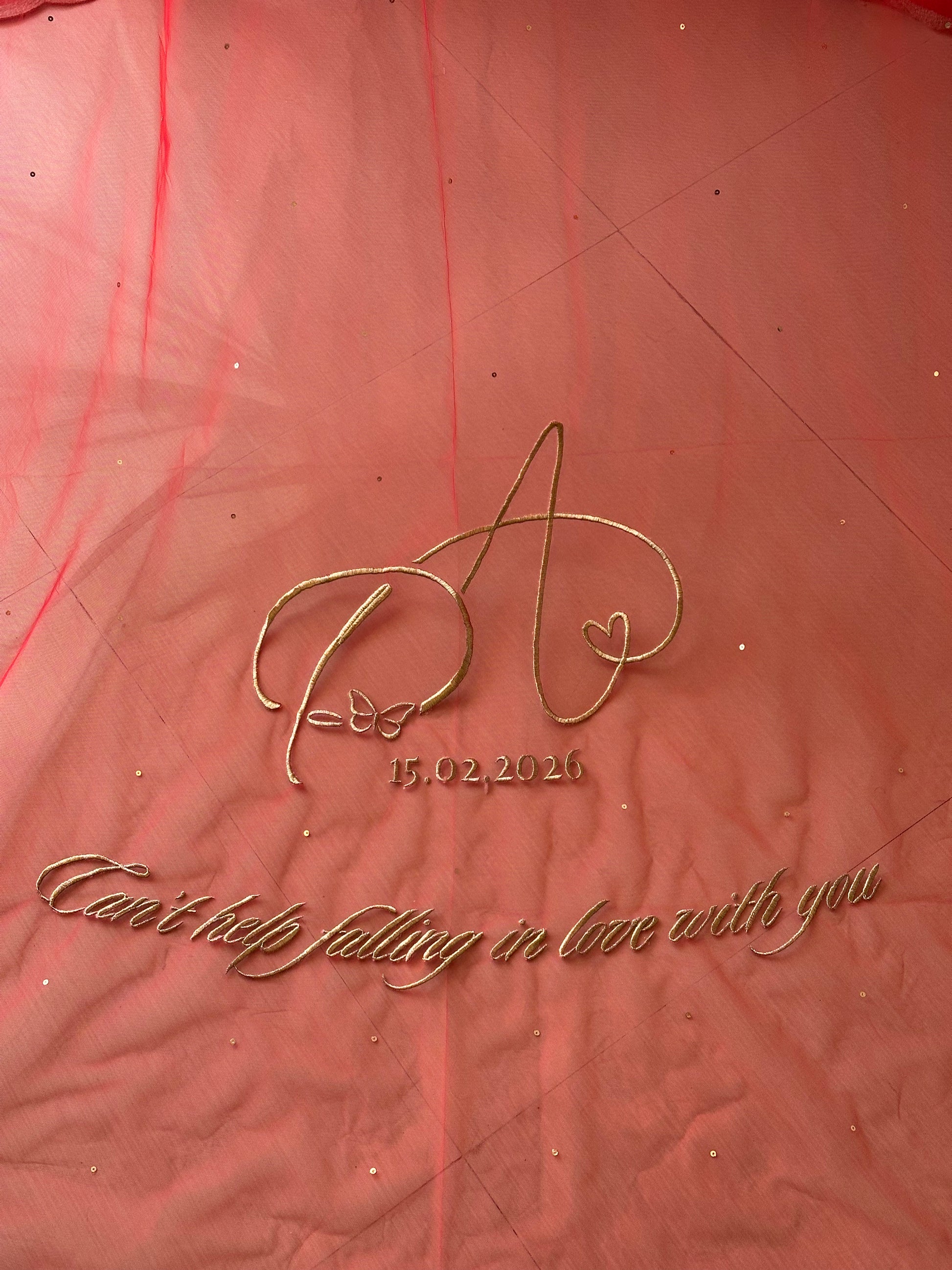 A classic cathedral-length red veil designed to stand the test of time. Rich gold tones beautifully complement traditional gold jewellery, creating an effortlessly regal bridal look. Intricate craftsmanship comes alive through a personalised gold-embroidered wedding logo and a heartfelt message, transforming the veil into a cherished keepsake long after the wedding day. A seamless blend of elegance and sentiment, created to honour the bride’s unforgettable journey.