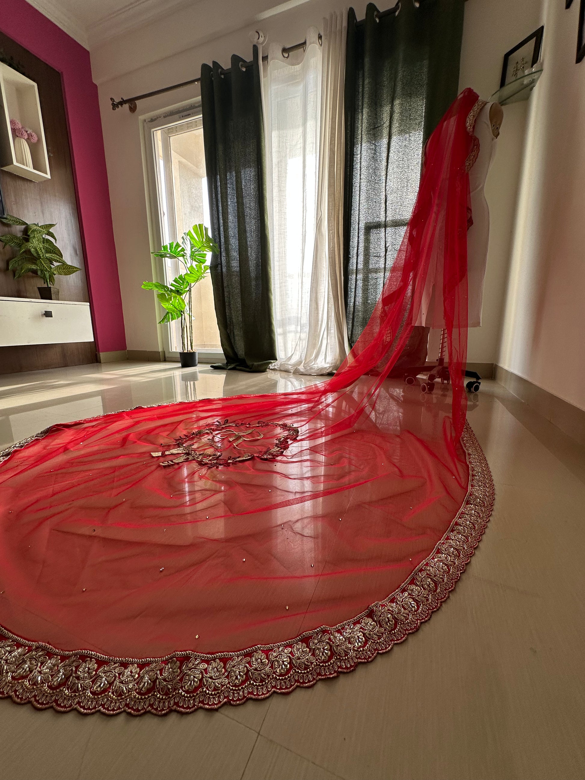 Hand-crafted in luminous red illusion tulle, this 3-metre cathedral-length veil flows like poetry — regal yet ethereal. The veil features a 30×30 inch personalised wedding logo, beautifully embroidered at its crown placement, inspired by the sacred imagery of Raadha-Krishna — a symbol of spiritual union and infinite devotion.