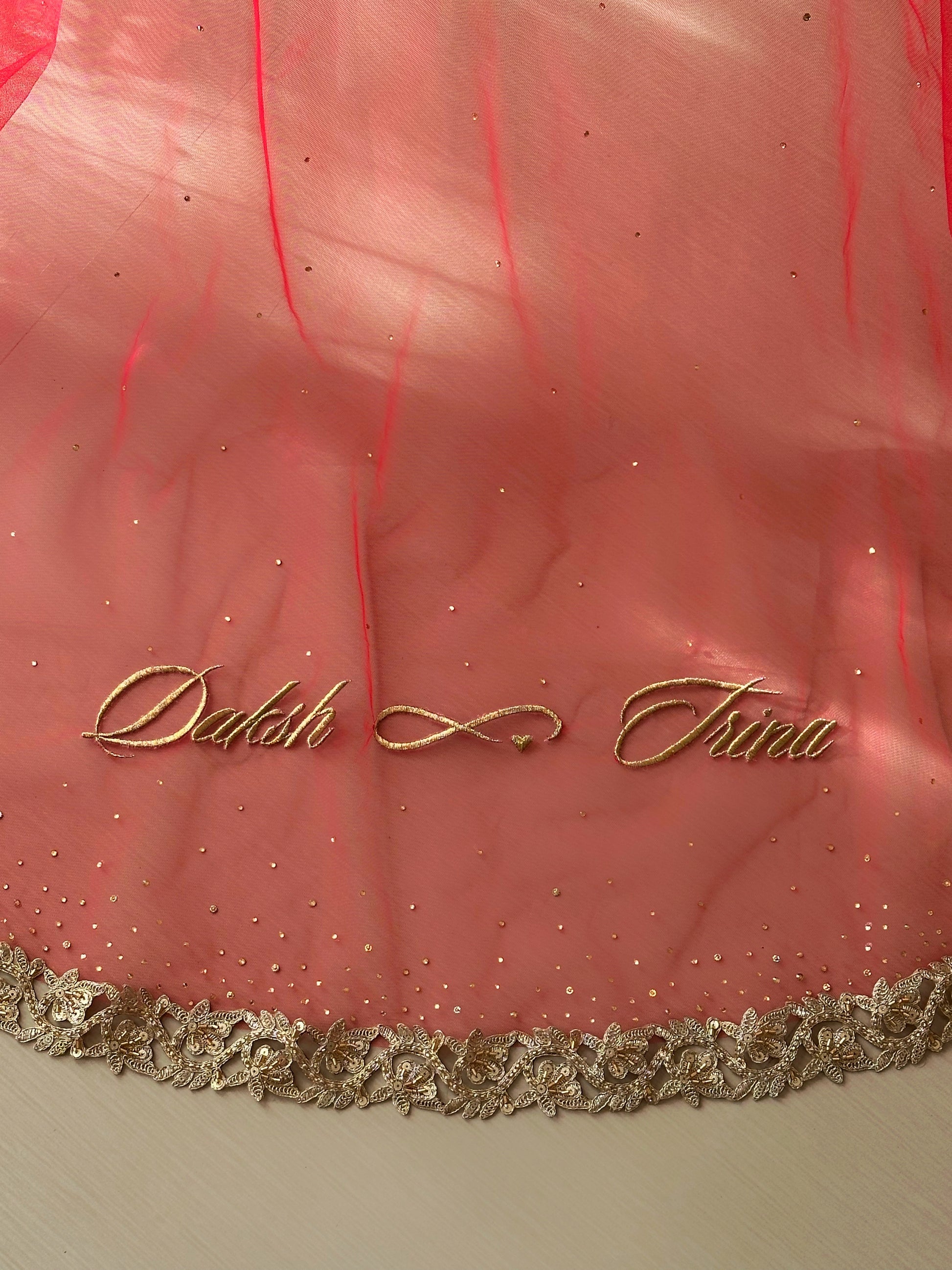 Unveil a masterpiece of timeless grandeur with our Ruby Woo Veil — where regal artistry meets modern elegance. Hand-crafted in a rich scarlet hue, this chapel-length veil sweeps gracefully at 2 meters, exuding a statement of bold romance.