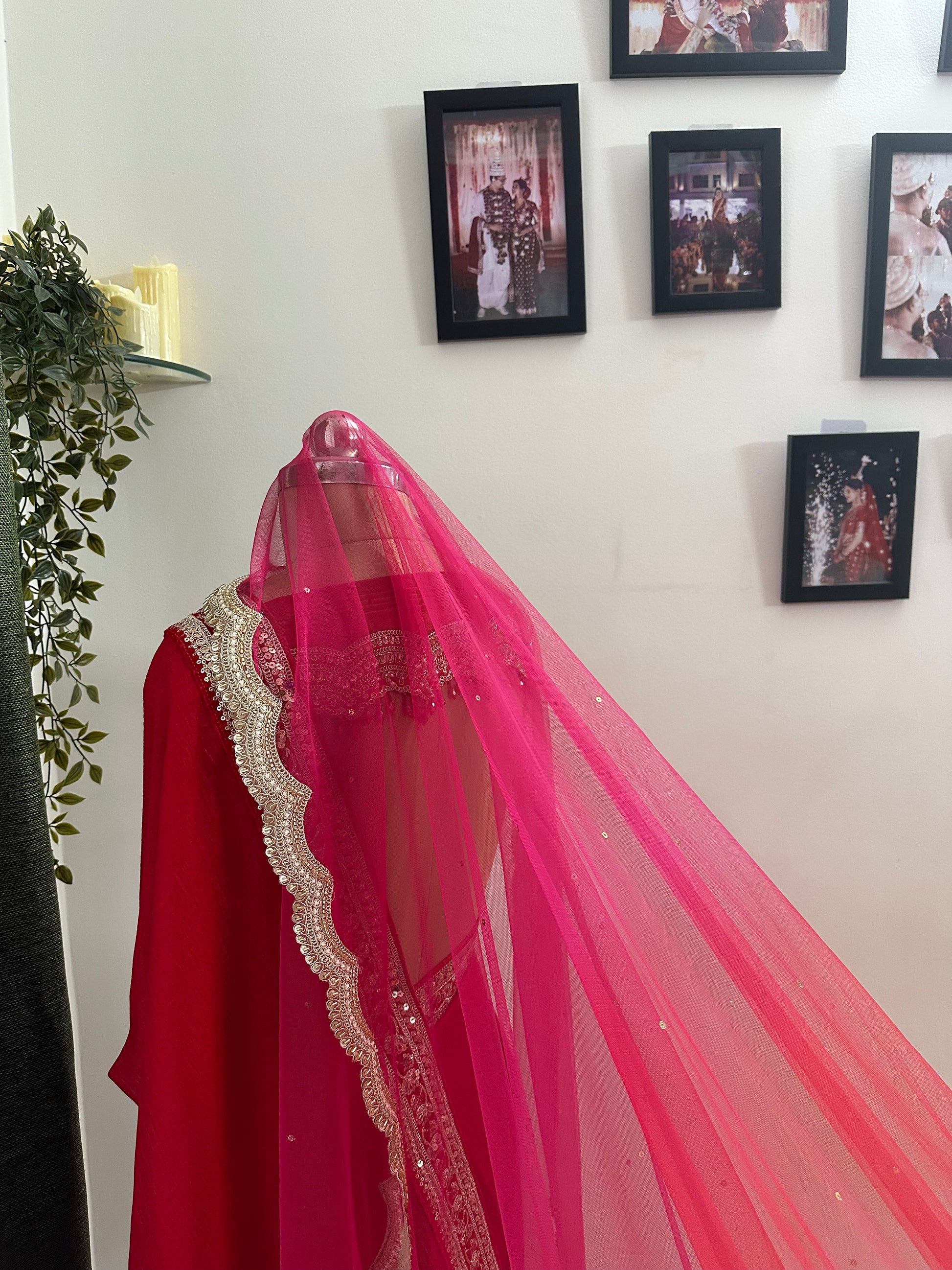 An heirloom-inspired ombré bridal veil, thoughtfully custom-made to echo the bride’s lehenga. Flowing from deep rani pink into rich red and finishing in a regal maroon, this veil creates a striking visual depth when worn as a face cover. The trail is adorned with thirty mango motifs, meticulously embroidered to mirror the lehenga’s design, while fine gold sequin detailing shimmers softly across the veil. Finished with a handcrafted gold scalloped border and personalised with the couple’s names and YBM’s signature infinity heart, this veil is a seamless extension of the bride’s ensemble — intentional, sentimental, and timeless.