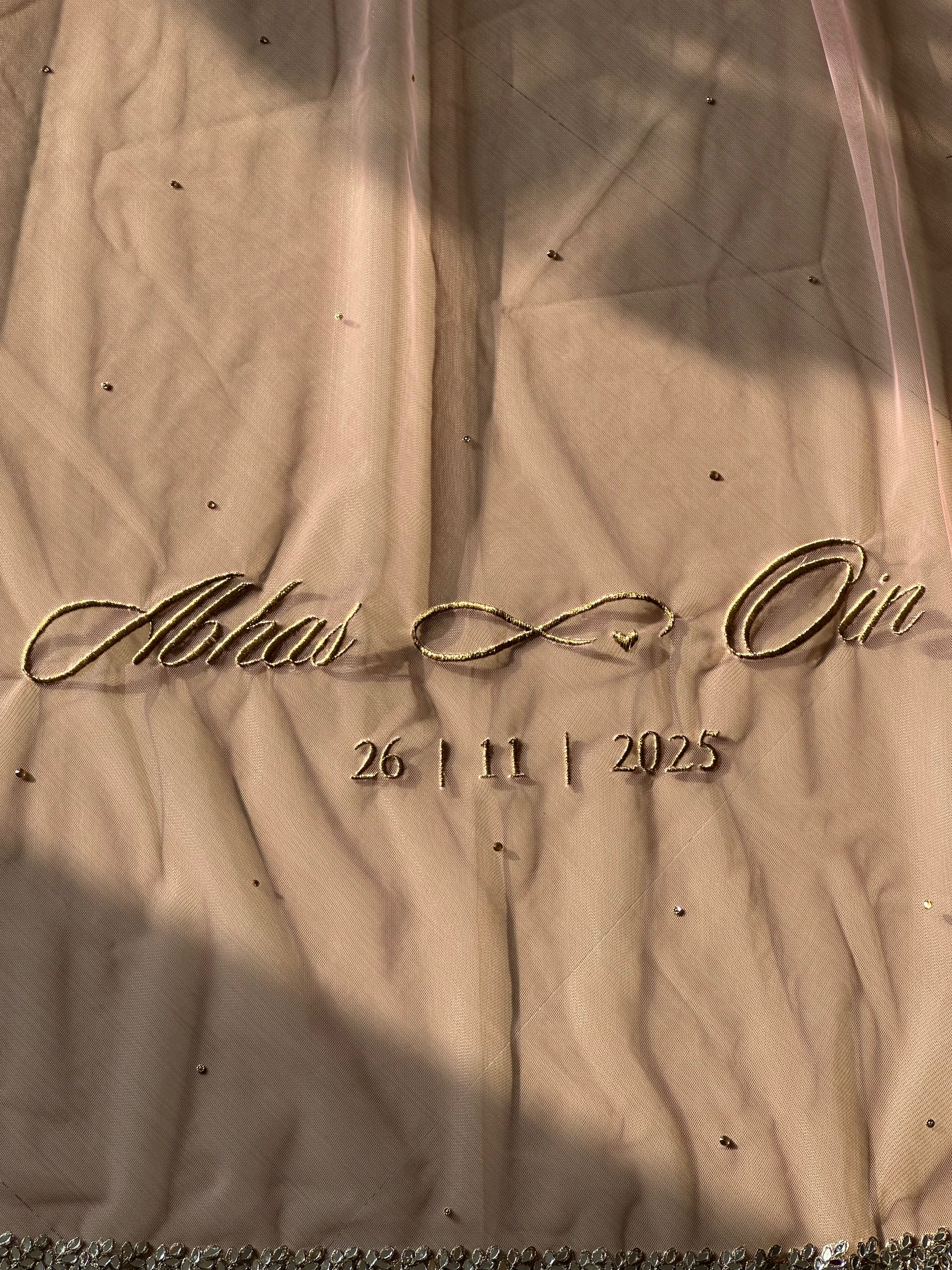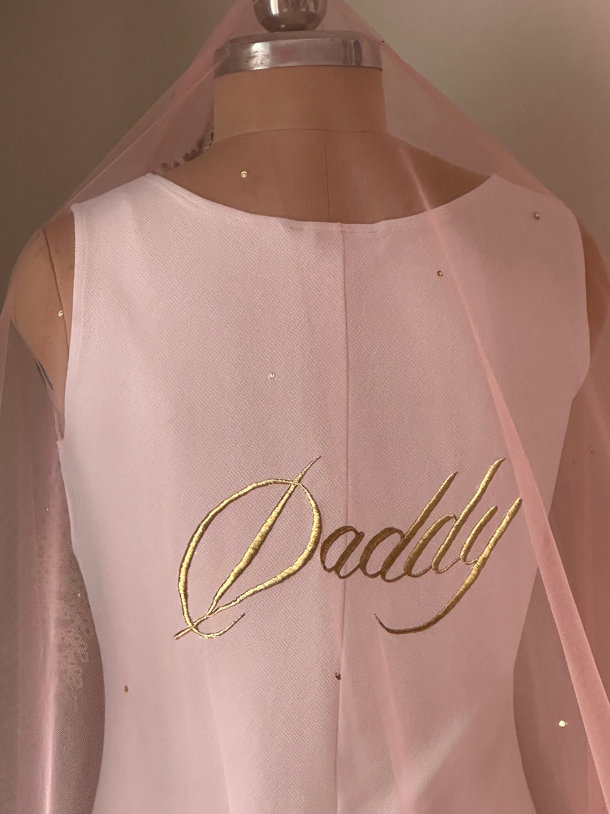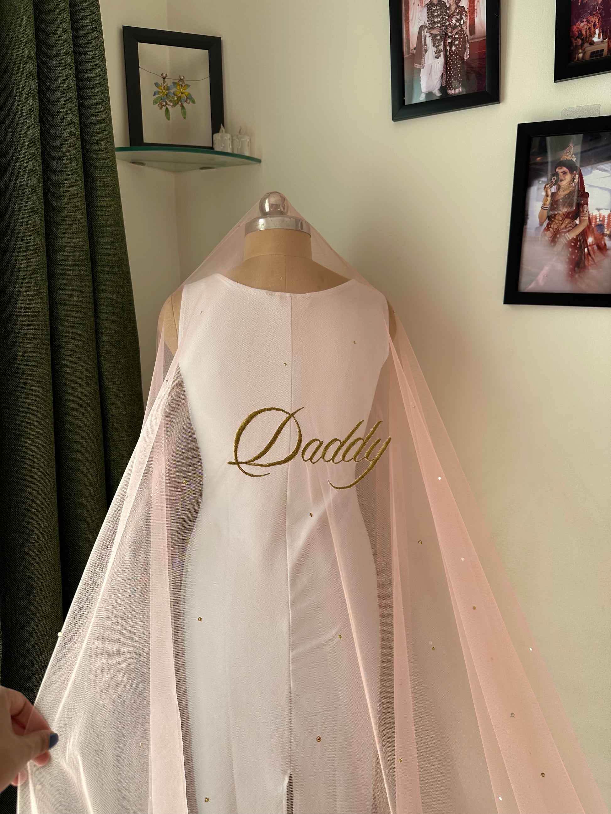 The face-cover placement adds a dreamy, ethereal charm, while the personal touches make it truly one of a kind — “Daddy” delicately embroidered on the back in loving tribute, and the couple’s name and wedding date gracing the trail as a timeless keepsake of the day their forever began.