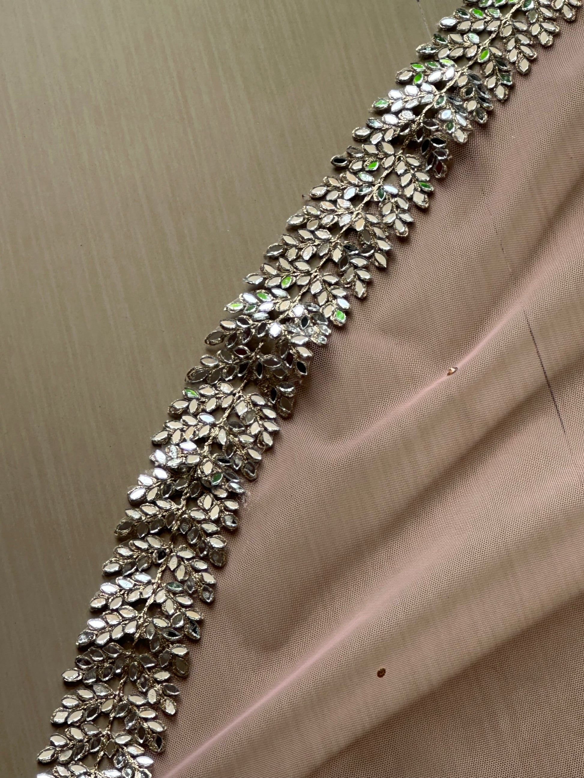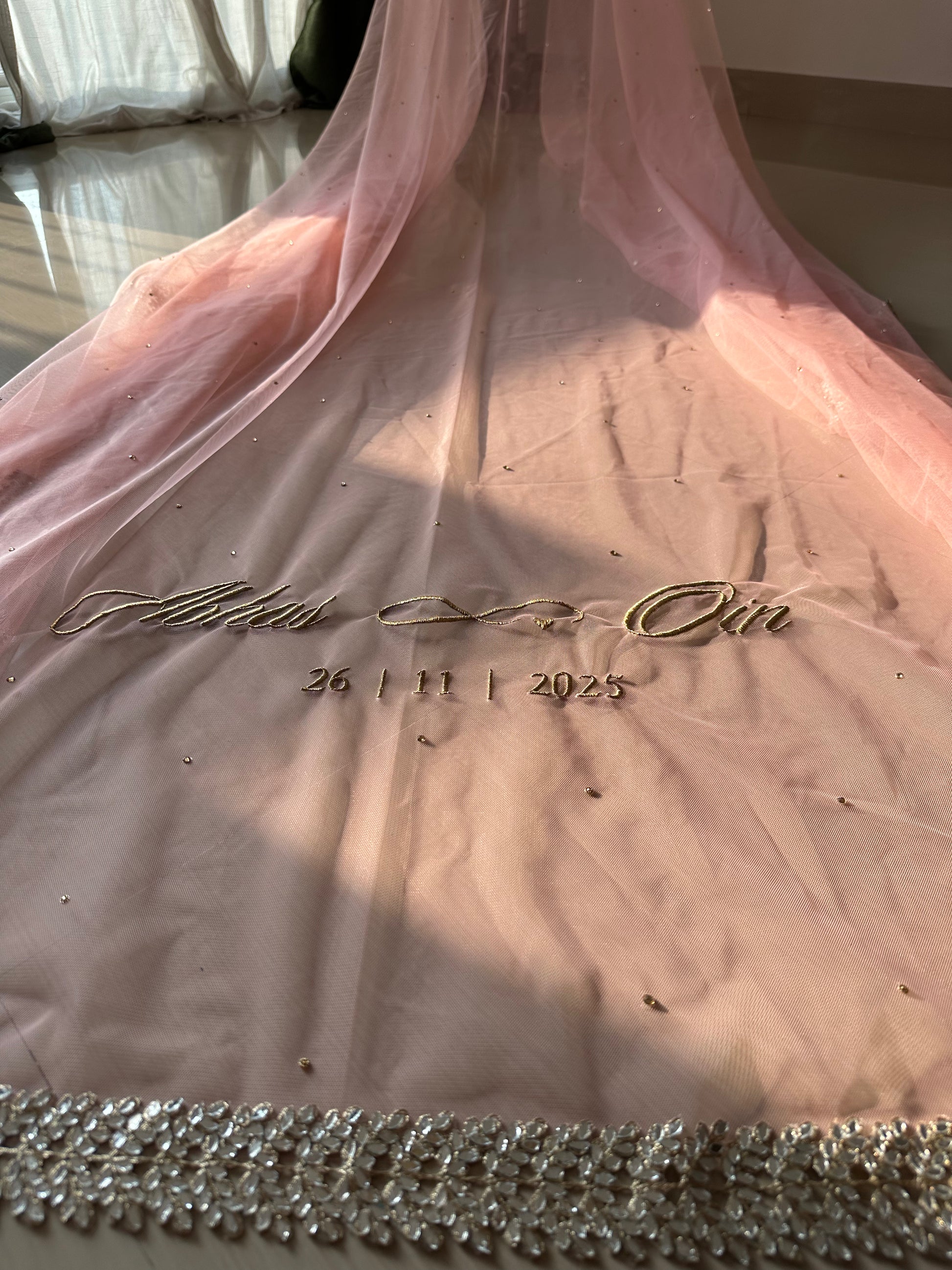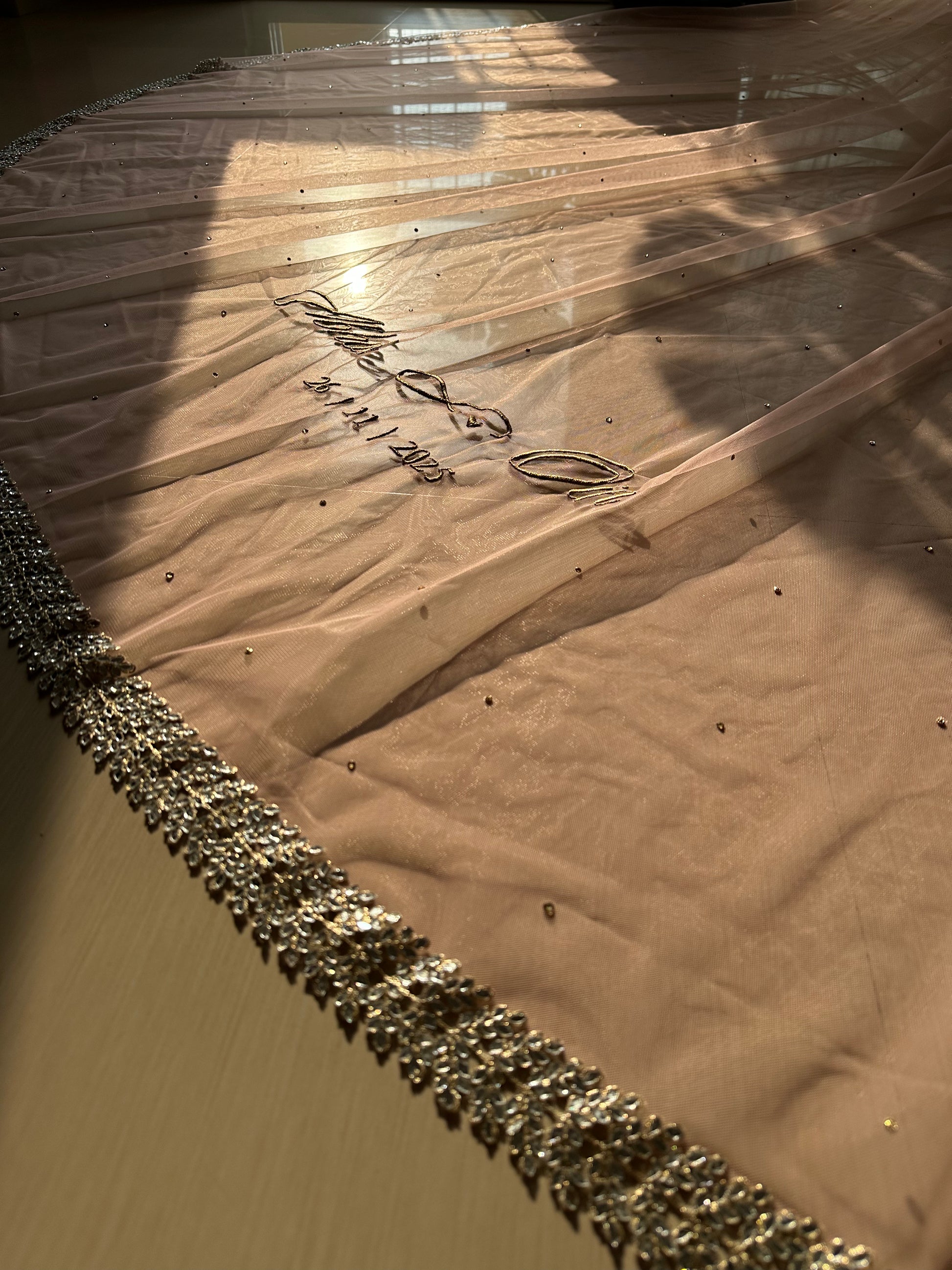 This Cathedral-length bridal veil in a soft peachy-pink hue shimmers with elegance, featuring a mirrored leaf border intricately embroidered with gold and silver stones that reflect light like tiny chandeliers. With a luxurious 120-inch flare and 3.5 metres of flowing tulle, it creates a stunning, regal silhouette as the bride walks down the aisle.
