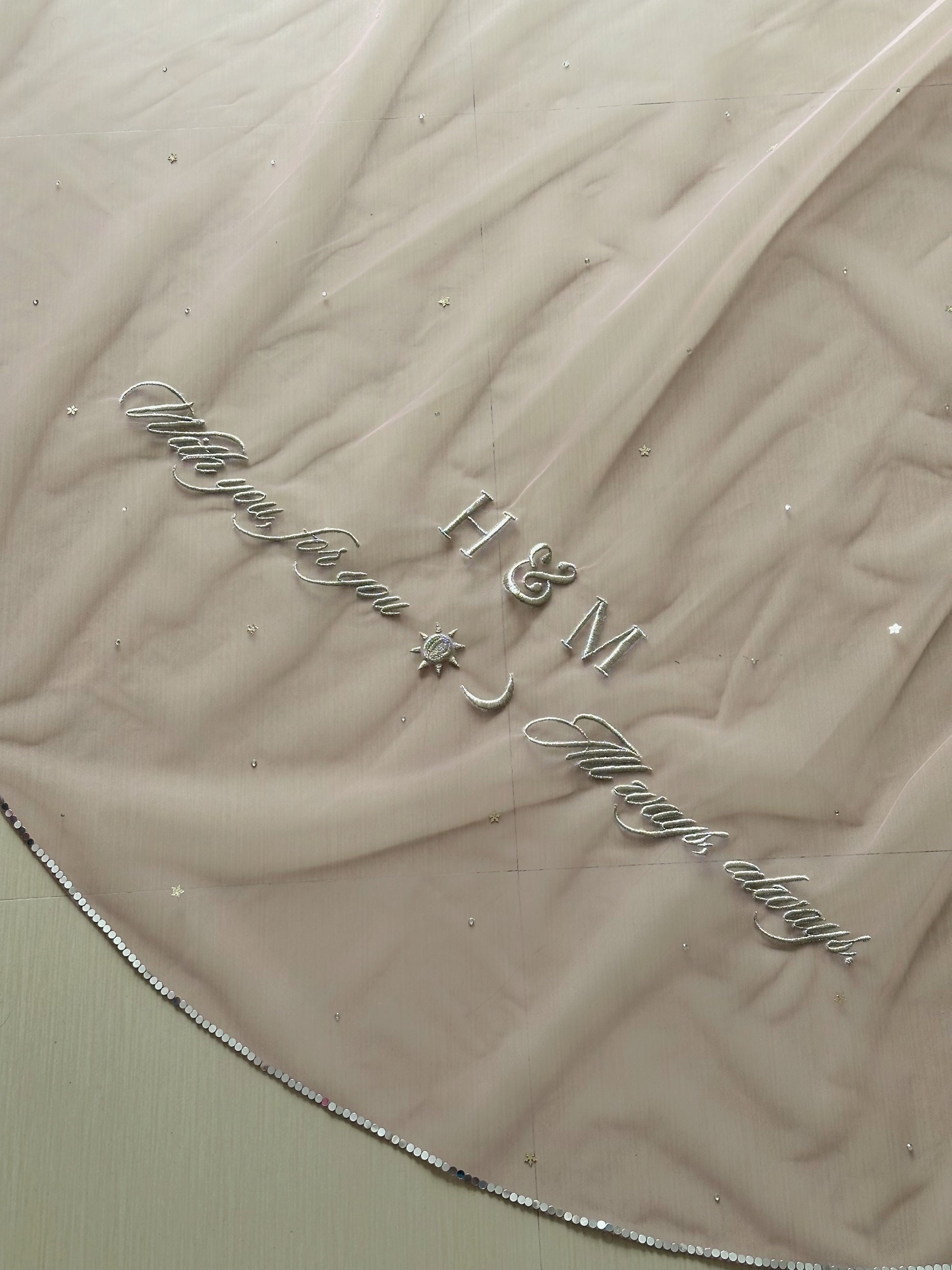 At the trail, personalization takes centre stage. The veil is embroidered with the couple’s initials “H & M”, accompanied by a heartfelt hand-embroidered inscription: