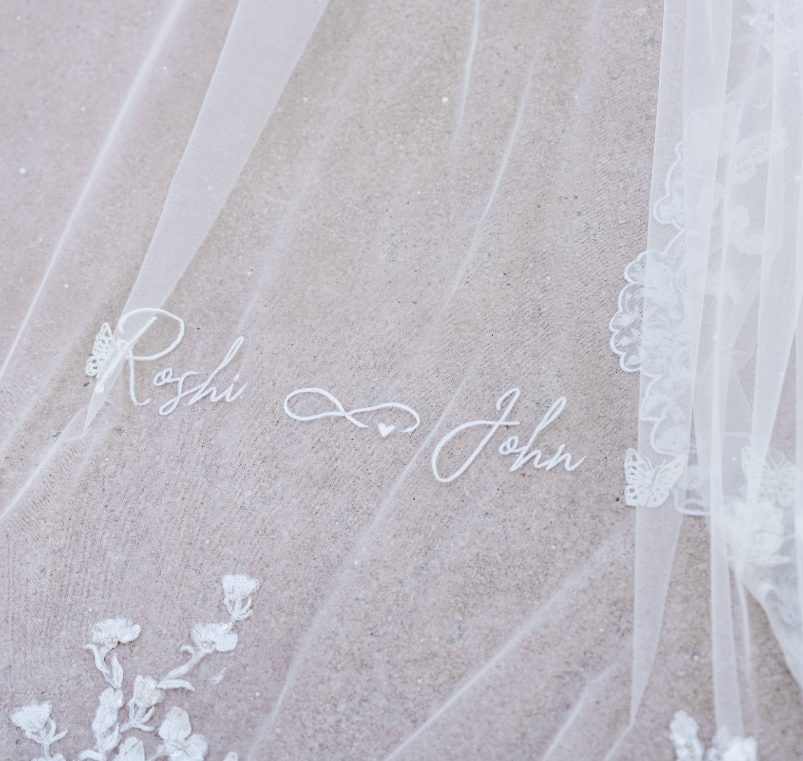 Love Story Veil : Ivory White Cathedral Petal Cut custom hand embroidered floral veil with love story personalisation