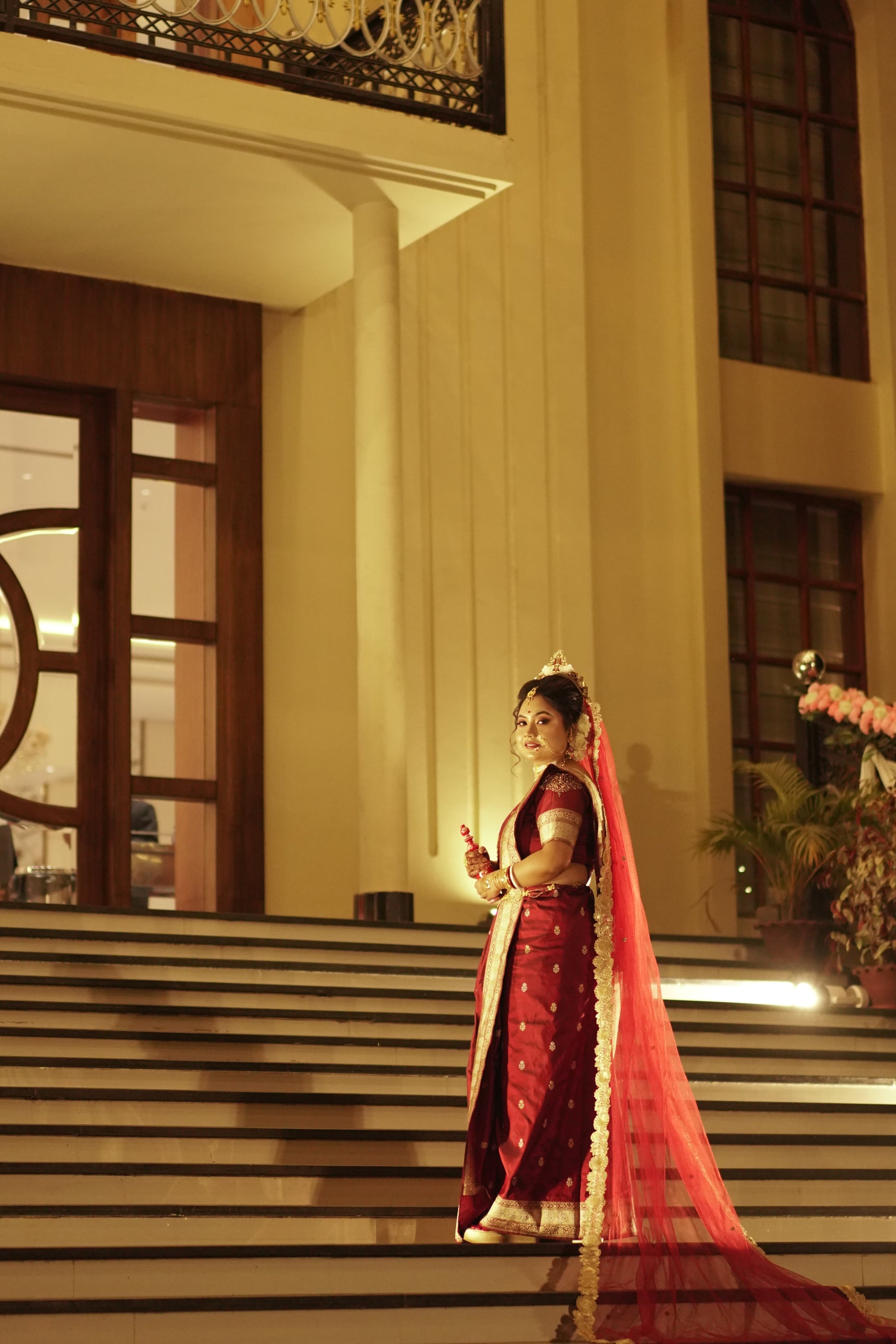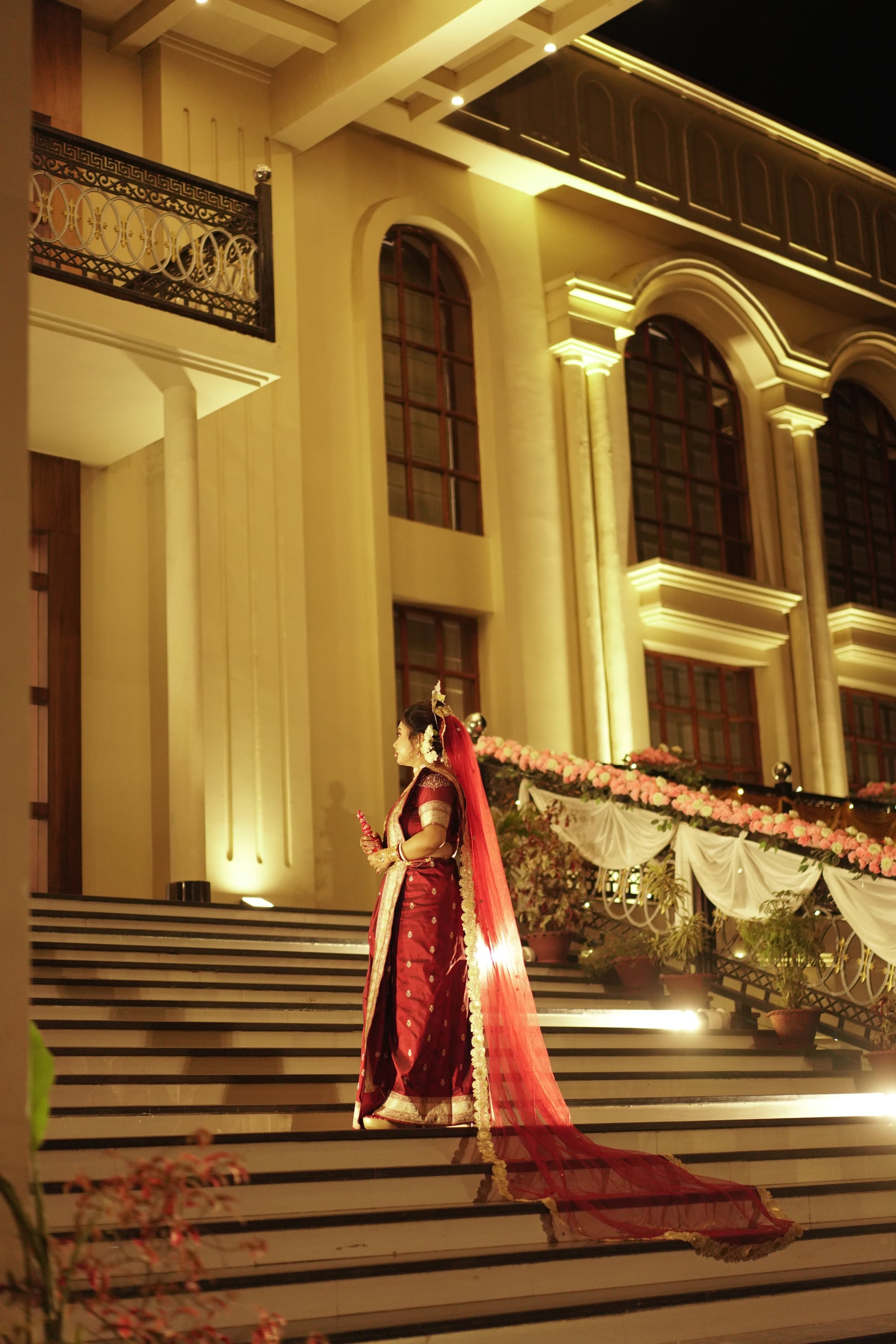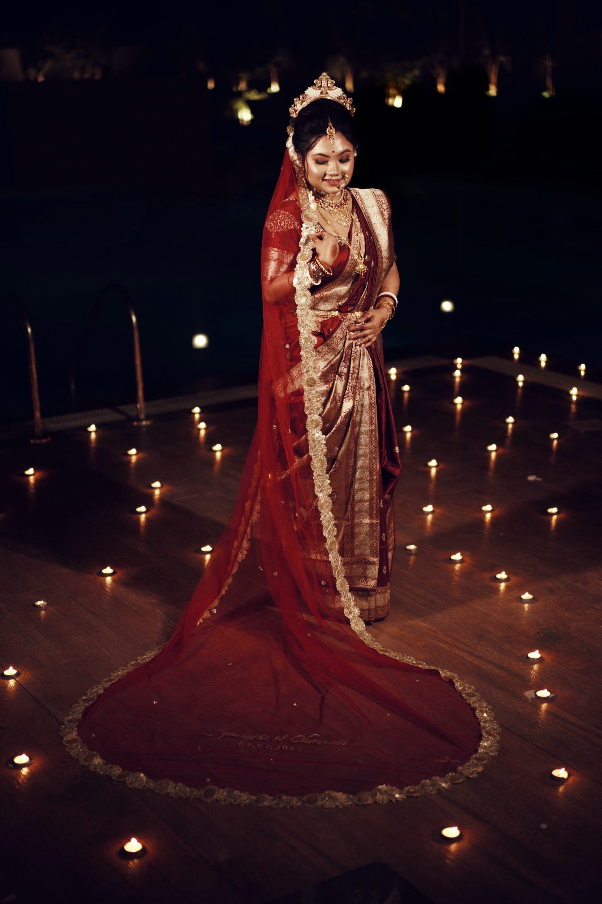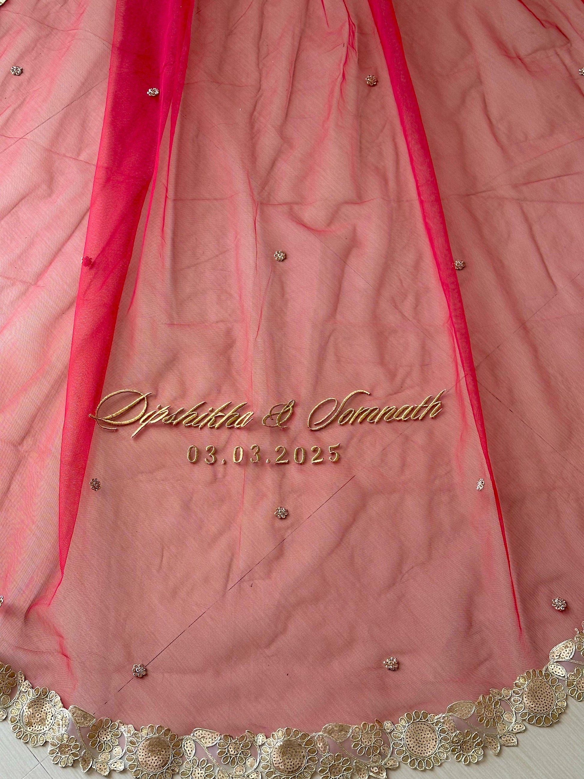 A timeless combination of maroon and gold, this veil holds a special place in our story — it’s a refined recreation of our very first design that began it all. Crafted with the same classic scalloped floral border and graceful waterfall drape, this edition adds a personal touch with the couple’s names and wedding date delicately embroidered — making it truly one of a kind.